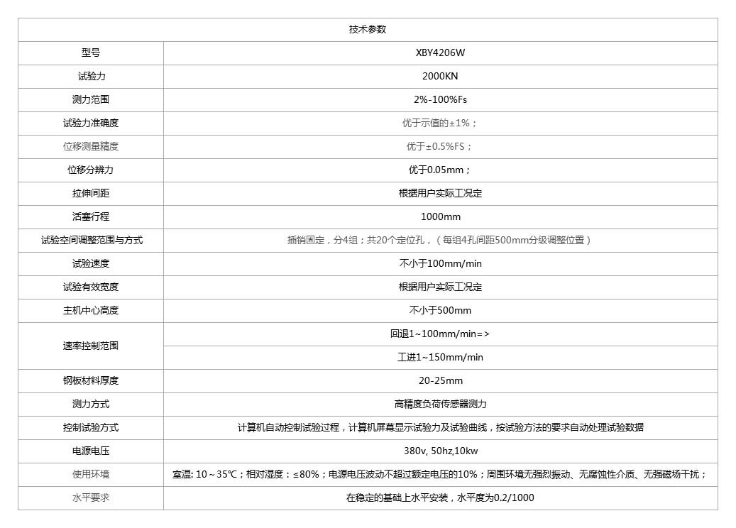 該試驗機采用機架整體鋼板焊接框架結構,單出桿雙作用活塞缸通過移動橫梁拉桿及前拉頭組成的反向架施加試驗力,通過銷軸方式聯(lián)接試樣,高精度負荷傳感器測力,根據(jù)試樣規(guī)格長度可有級調整后拉頭拉伸空間,后拉頭采用電動減速調整,手動竄銷固定于兩側框架,為計算機屏幕顯示試驗力及試驗曲線,按試驗方法的要求自動處理試驗數(shù)據(jù),本機主要適用于電力附具、電線電纜、雙鉤、安全帶、鏈條、鏈條葫蘆、大型標準件件、鋼絲繩、鋼絞線等繩類材料的拉伸強度測試驗。